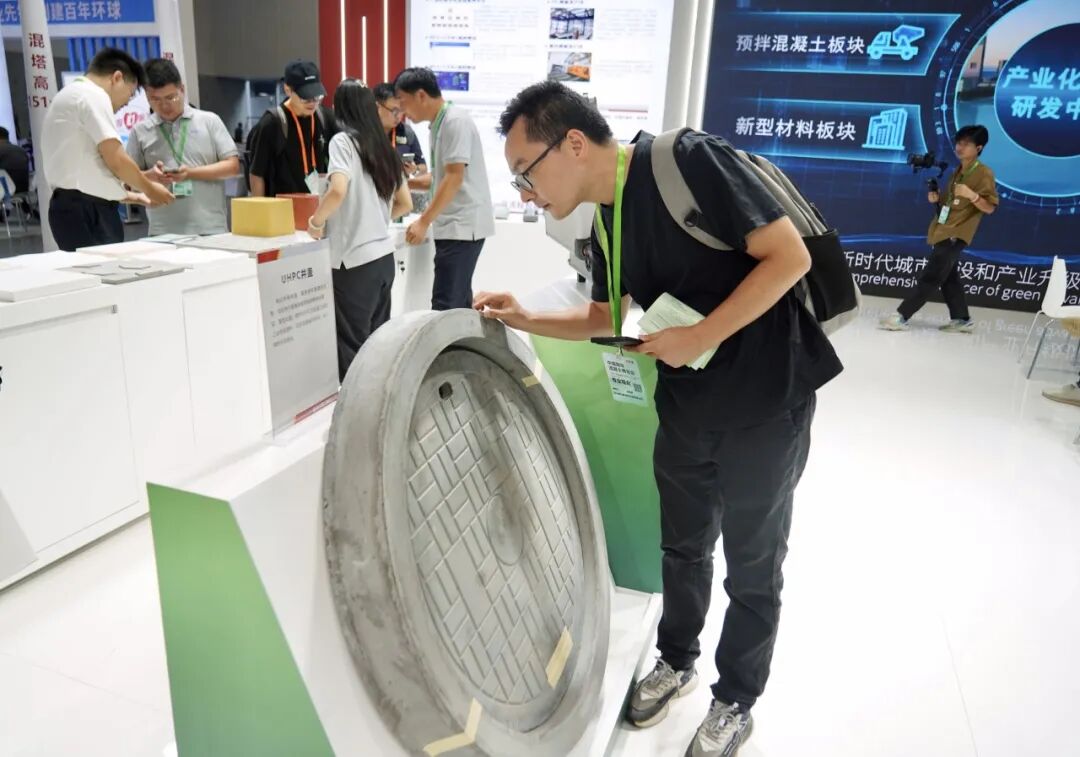 来到展会现场,建工新材公司展台内最有特色的构件便是一个直径约1米的混凝土井盖,相比传统的铸铁和水泥井盖,这个井盖全部都是由UHPC高性能混凝土制作而成。